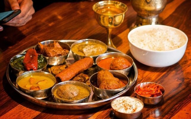 – Thali: Khay thức ăn gồm cơm, bánh Naan, cà ri đậu khoai tây và sữa chua không đường cùn một số nguyên liệu làm nên sự khác biệt.
